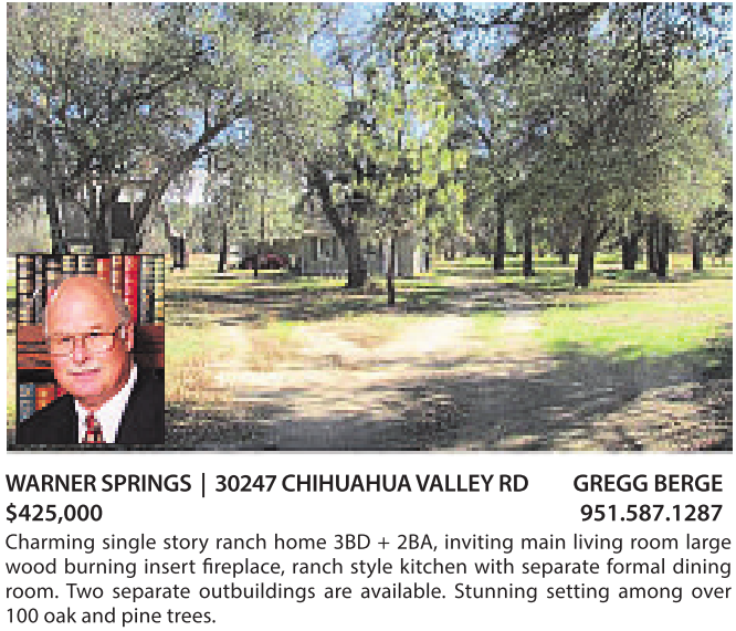 WARNER SPRINGS | 30247 CHIHUAHUAVALLEY RD GREGGBERGE $425,000 951.587.1287 Charming single story ranch home 3BD + 2BA, inviting main living room large wood burning insert fireplace, ranch style kitchen with separate formal dining room. Two separate outbuildings are available. Stunning setting among over 100 oak and pine trees.