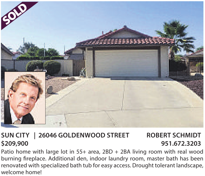 SUN CITY | 26046 GOLDENWOOD STREET ROBERT SCHMIDT $209,900 951.672.3203 Patio home with large lot in 55+ area, 2BD + 2BA living room with real wood burning fireplace. Additional den, indoor laundry room, master bath has been renovatedwith specialized bath tub foreasyaccess.Drought tolerant landscape, welcome home!