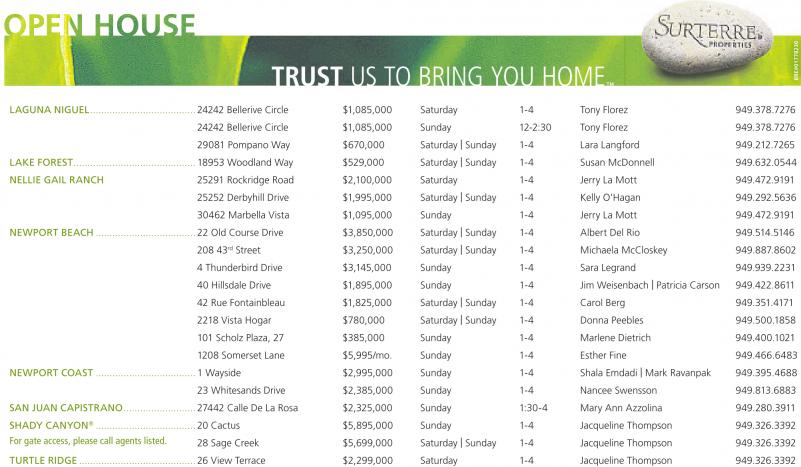 LAGUNA NIGUEL...................................... 24242 Bellerive Circle $1,085,000 Saturday 1-4 Tony Florez 949.378.7276 24242 Bellerive Circle $1,085,000 Sunday 12-2:30 Tony Florez 949.378.7276 29081 Pompano Way $670,000 Saturday | Sunday 1-4 Lara Langford 949.212.7265 LAKE FOREST............................................ 18953 Woodland Way $529,000 Saturday | Sunday 1-4 Susan McDonnell 949.632.0544 NELLIE GAIL RANCH 25291 Rockridge Road $2,100,000 Saturday 1-4 Jerry La Mott 949.472.9191 25252 Derbyhill Drive $1,995,000 Saturday | Sunday 1-4 Kelly O'Hagan 949.292.5636 30462 Marbella Vista $1,095,000 Sunday 1-4 Jerry La Mott 949.472.9191 NEWPORT BEACH .................................... 22 Old Course Drive $3,850,000 Saturday | Sunday 1-4 Albert Del Rio 949.514.5146 208 43 rd Street $3,250,000 Saturday | Sunday 1-4 Michaela McCloskey 949.887.8602 4 Thunderbird Drive $3,145,000 Sunday 1-4 Sara Legrand 949.939.2231 40 Hillsdale Drive $1,895,000 Sunday 1-4 Jim Weisenbach | Patricia Carson 949.422.8611 42 Rue Fontainbleau $1,825,000 Saturday | Sunday 1-4 Carol Berg 949.351.4171 2218 Vista Hogar $780,000 Saturday | Sunday 1-4 Donna Peebles 949.500.1858 101 Scholz Plaza, 27 $385,000 Sunday 1-4 Marlene Dietrich 949.400.1021 1208 Somerset Lane $5,995/mo. Sunday 1-4 Esther Fine 949.466.6483 NEWPORT COAST .................................... 1 Wayside $2,995,000 Sunday 1-4 Shala Emdadi | Mark Ravanpak 949.395.4688 23 Whitesands Drive $2,385,000 Sunday 1-4 Nancee Swensson 949.813.6883 SAN JUAN CAPISTRANO.......................... 27442 Calle De La Rosa $2,325,000 Sunday 1:30-4 Mary Ann Azzolina 949.280.3911 SHADY CANYON ® .................................... 20 Cactus $5,895,000 Sunday 1-4 Jacqueline Thompson 949.326.3392 For gate access, please call agents listed. 28 Sage Creek $5,699,000 Saturday | Sunday 1-4 Jacqueline Thompson 949.326.3392 TURTLE RIDGE .......................................... 26 View Terrace $2,299,000 Saturday 1-4 Jacqueline Thompson 949.326.3392