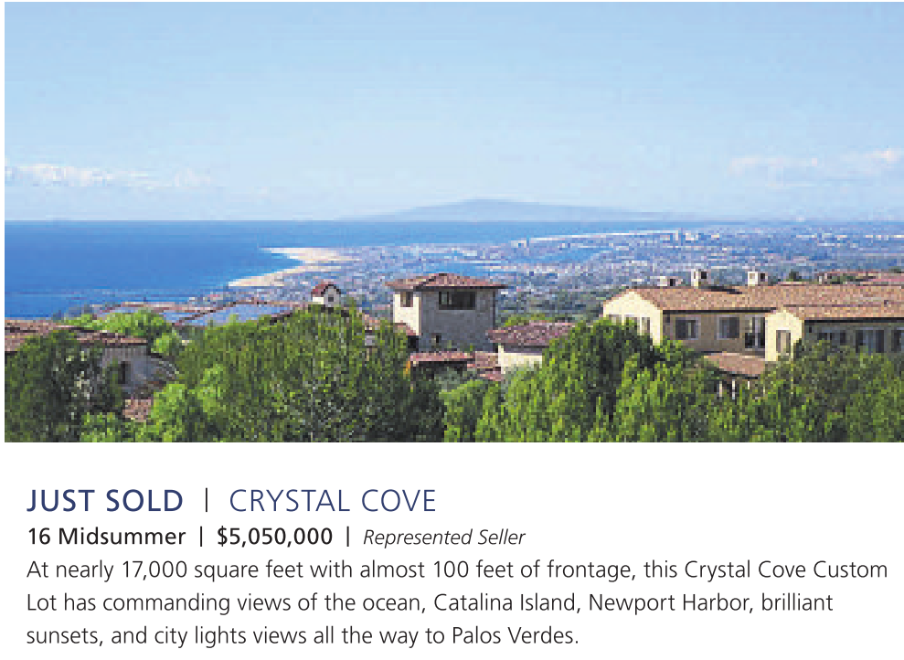 JUST SOLD | CRYSTAL COVE 16 Midsummer | $5,050,000 | Represented Seller At nearly 17,000 square feet with almost 100 feet of frontage, this Crystal Cove Custom Lot has commanding views of the ocean, Catalina Island, Newport Harbor, brilliant sunsets, and city lights views all the way to Palos Verdes. See also