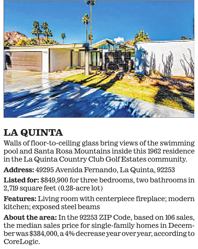 About the area: In the 92253 ZIP Code, based on 106 sales, the median sales price for single-family homes in December was $384,000, a 4% decrease year over year, according to CoreLogic.