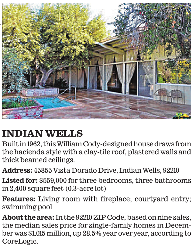 About the area: In the 92210 ZIP Code, based on nine sales, the median sales price for single-family homes in December was $1.015 million, up 28.5% year over year, according to CoreLogic.