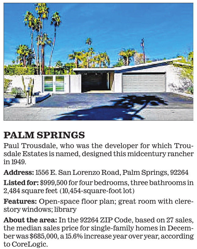 About the area: In the 92264 ZIP Code, based on 27 sales, the median sales price for single-family homes in December was $685,000, a15.6% increase year over year, according to CoreLogic.