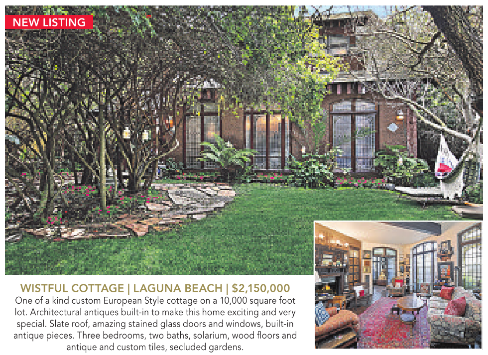 NEW LISTING WISTFUL COTTAGE | LAGUNA BEACH | $2,150,000 One ofakind custom European Style cottage on a10,000 square foot lot. Architectural antiques built-in tomake this home exciting and very special. Slate roof, amazing stained glass doors and windows, built-in antique pieces. Three bedrooms, two baths, solarium, wood floors and antique and custom tiles, secluded gardens. See also
