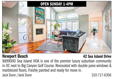 NewportBeach 42 SeaIsland Drive $899000 Sea Island HOA is one of the premier luxury suburban community in OC next to Big Canyon Golf Course. Renovated with double pane windows & marbleized floors. Freshly painted and ready for move in. JackDunn /Jack Dunn 310-717-6356