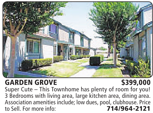 GARDEN GROVE $399,000 Super Cute – This Townhome has plenty of room for you! 3Bedrooms with living area, large kitchen area, dining area. Association amenities include;low dues,pool, clubhouse.Price to Sell.For more info: 714/964-2121