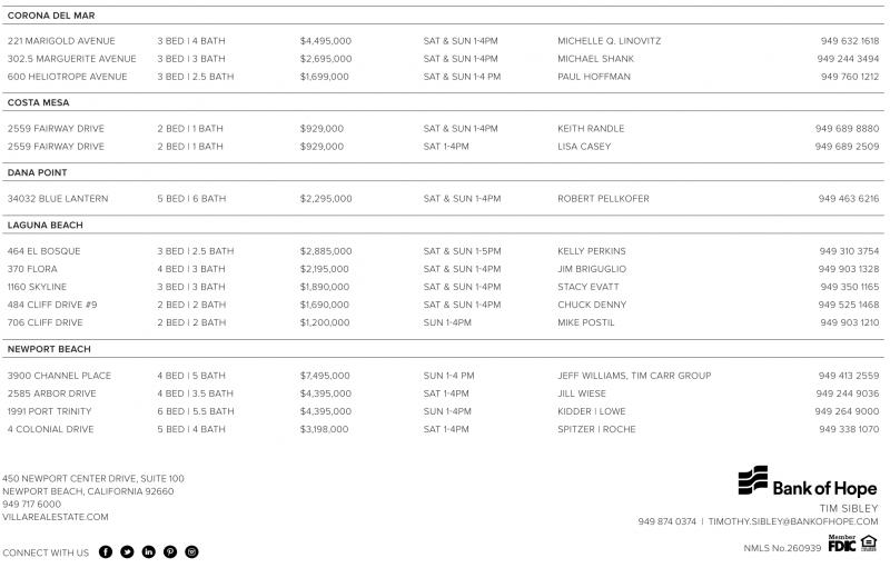 464 EL BOSQUE 3 BED | 2.5 BATH $2,885,000 SAT & SUN 1-5PM KELLY PERKINS 949 310 3754 370 FLORA 4 BED | 3 BATH $2,195,000 SAT & SUN 1-4PM JIM BRIGUGLIO 949 903 1328 1160 SKYLINE 3 BED | 3 BATH $1,890,000 SAT & SUN 1-4PM STACY EVATT 949 350 1165 484 CLIFF DRIVE #9 2 BED | 2 BATH $1,690,000 SAT & SUN 1-4PM CHUCK DENNY 949 525 1468 706 CLIFF DRIVE 2 BED | 2 BATH $1,200,000 SUN 1-4PM MIKE POSTIL 949 903 1210