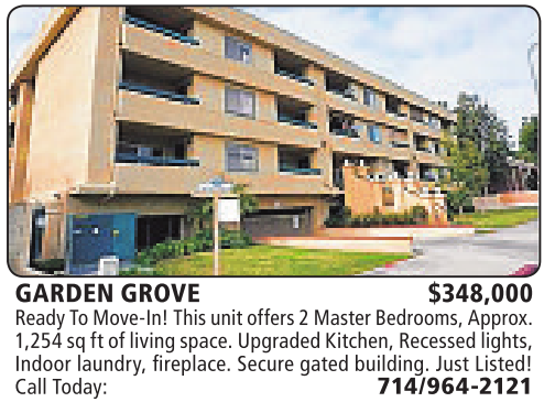 GARDEN GROVE $348,000 ReadyToMove-In! This unit offers2MasterBedrooms,Approx. 1,254sqftofliving space. Upgraded Kitchen, Recessedlights, Indoor laundry, fireplace. Secure gated building. Just Listed! Call Today: 714/964-2121