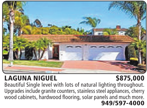 LAGUNA NIGUEL $875,000 Beautiful Single level with lots ofnatural lighting throughout. Upgrades includegranitecounters,stainlesssteel appliances,cherry wood cabinets, hardwood flooring,solar panels andmuchmore.