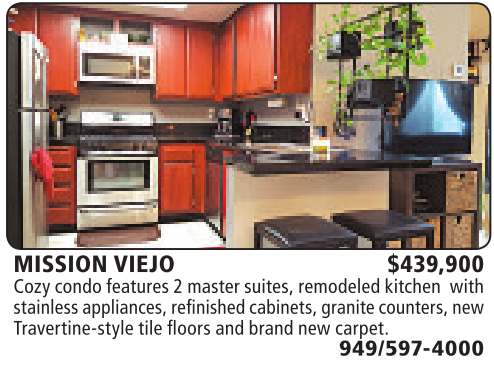 MISSION VIEJO $439,900 Cozy condofeatures 2master suites, remodeledkitchen with stainlessappliances, refinished cabinets,granite counters,new Travertine-style tile floors andbrandnew carpet.