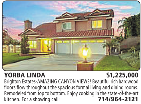 YORBA LINDA $1,225,000 Brighton Estates-AMAZING CANYON VIEWS! Beautifulrichhardwood floors flow throughout thespacious formal living anddining rooms. Remodeledfrom toptobottom. Enjoy cookinginthe state-of-the-art kitchen. Forashowingcall: 714/964-2121