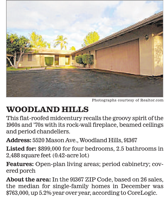 WOODLAND HILLS This flat-roofed midcentury recalls the groovy spirit of the 1960s and ’70s with its rock-wall fireplace, beamed ceilings and period chandeliers.