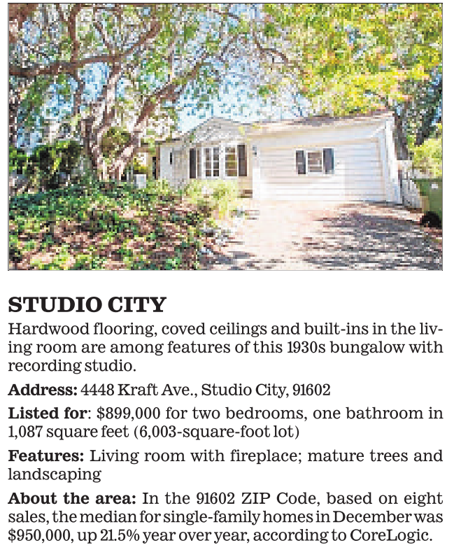STUDIO CITY Hardwood flooring, coved ceilings and built-ins in the living room are among features of this 1930s bungalow with recording studio. Address: 4448 Kraft Ave., Studio City, 91602 Listed for: $899,000 for two bedrooms, one bathroom in 1,087 square feet (6,003-square-foot lot) Features: Living room with fireplace; mature trees and landscaping About the area: In the 91602 ZIP Code, based on eight sales, the median for single-family homes in December was $950,000, up 21.5% year over year, according to CoreLogic.