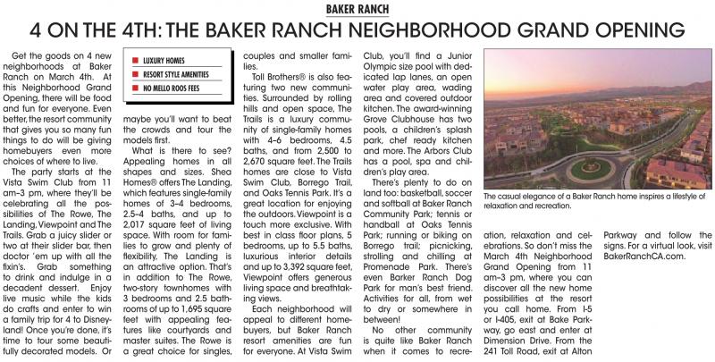 Get the goods on 4 new neighborhoods at Baker Ranch on March 4th. At this Neighborhood Grand Opening, there will be food and fun for everyone. Even better,the resortcommunity that gives you so many fun things to do will be giving homebuyers even more choices of where to live.