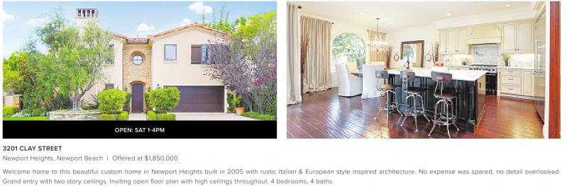 OPEN: SAT 1-4PM 3201 CLAY STREET Newport Heights, Newport Beach | Offered at $1,850,000 Welcome home to this beautiful custom home in Newport Heights built in 2005 with rustic Italian & European style inspired architecture. No expense was spared, no detail overlooked. Grand entry with two story ceilings. Inviting open floor plan with high ceilings throughout. 4 bedrooms, 4 baths. See also