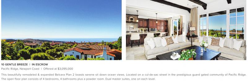 10 GENTLE BREEZE | IN ESCROW Pacific Ridge, Newport Coast | Offered at $3,095,000 This beautifully remodeled & expanded Belcara Plan 2 boasts serene sit down ocean views. Located on a cul-de-sac street in the prestigious guard gated community of Pacific Ridge. The open floor plan consists of 4 bedrooms, 4 bathrooms plus a powder room. Dual master suites, one on each level.