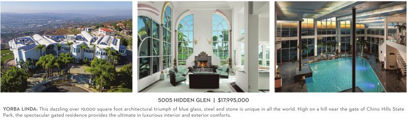 YORBA LINDA: This dazzling over 19,000 square foot architectural triumph of blue glass, steel and stone is unique in all the world. High on a hill near the gate of Chino Hills State Park, the spectacular gated residence provides the ultimate in luxurious interior and exterior comforts.