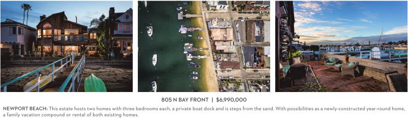 805 N BAY FRONT | $6,990,000 NEWPORT BEACH: This estate hosts two homes with three bedrooms each, a private boat dock and is steps from the sand. With possibilities as a newly-constructed year-round home, a family vacation compound or rental of both existing homes.