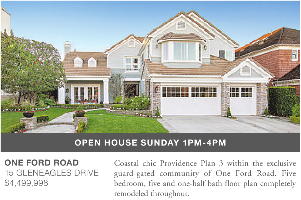 OPEN HOUSE SUNDAY 1PM-4PM ONE FORD ROAD 15 GLENEAGLES DRIVE $4,499,998 Coastal chic Providence Plan 3 within the exclusive guard-gated community of One Ford Road. Five bedroom, five and one-half bath floor plan completely remodeled throughout. See also