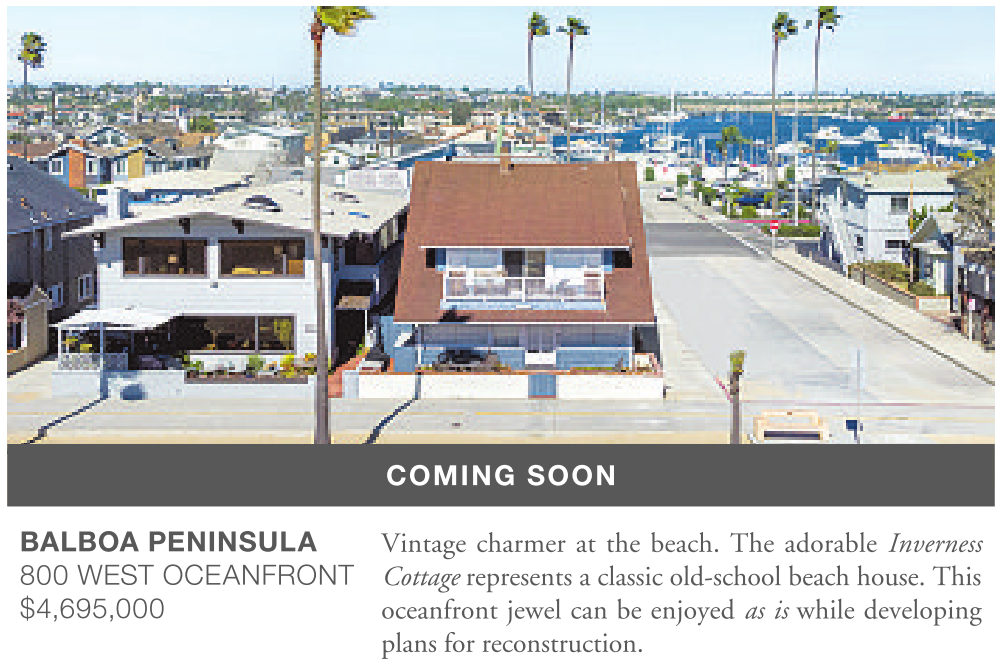 BALBOA PENINSULA 800 WEST OCEANFRONT $4,695,000 COMING SOON Vintage charmer at the beach. The adorable Inverness Cottage represents a classic old-school beach house. This oceanfront jewel can be enjoyed as is while developing plans for reconstruction.