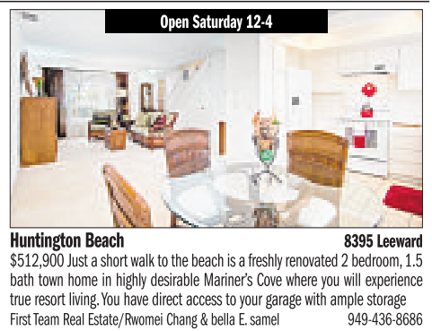 Open Saturday 12-4 HuntingtonBeach 8395 Leeward $512,900Just ashortwalk to the beach is afreshly renovated2bedroom,1.5 bath town home in highly desirable Mariner’sCove whereyou will experience true resortliving.Youhavedirectaccess to your garage with ample storage FirstTeam RealEstate/Rwomei Chang &bella E. samel 949-436-8686