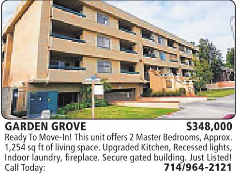 GARDEN GROVE $348,000 ReadyToMove-In! This unit offers2MasterBedrooms,Approx. 1,254sqftofliving space. Upgraded Kitchen, Recessedlights, Indoor laundry, fireplace. Secure gated building. Just Listed! Call Today: 714/964-2121