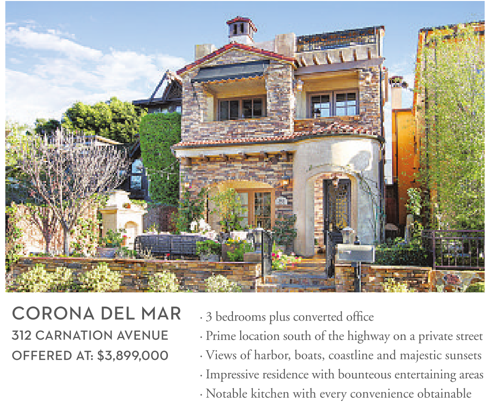 CORONA DEL MAR 312 CARNATION AVENUE OFFERED AT: $3,899,000 ·3 bedrooms plus converted office ·Prime location south of the highway on a private street ·Views of harbor, boats, coastline and majestic sunsets ·Impressive residence with bounteous entertaining areas ·Notable kitchen with every convenience obtainable See also
