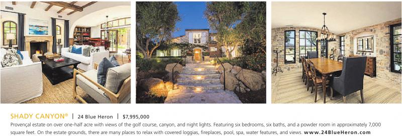 SHADY CANYON ® | 24 Blue Heron | $7,995,000 Provençal estate on over one-half acre with views of the golf course, canyon, and night lights. Featuring six bedrooms, six baths, and a powder room in approximately 7,000 square feet. On the estate grounds, there are many places to relax with covered loggias, fireplaces, pool, spa, water features, and views. www.24BlueHeron.com
