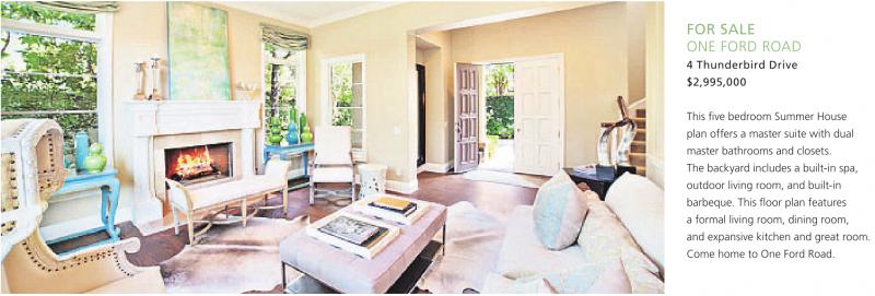 FOR SALE ONE FORD ROAD 4 Thunderbird Drive $2,995,000 This five bedroom Summer House plan offers a master suite with dual master bathrooms and closets. The backyard includes a built-in spa, outdoor living room, and built-in barbeque. This floor plan features a formal living room, dining room, and expansive kitchen and great room. Come home to One Ford Road.
