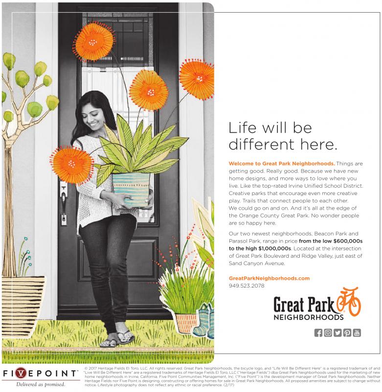 Life will be different here. Welcome to Great Park Neighborhoods. Things are getting good. Really good. Because we have new home designs, and more ways to love where you live. Like the top-rated Irvine Unified School District. Creative parks that encourage even more creative play. Trails that connect people to each other. We could go on and on. And it’s all at the edge of the Orange County Great Park. No wonder people are so happy here. Our two newest neighborhoods, Beacon Park and Parasol Park, range in price from the low $600,000s to the high $1,000,000s. Located at the intersection of Great Park Boulevard and Ridge Valley, just east of Sand Canyon Avenue. GreatParkNeighborhoods.com 949.523.2078 © 2017 Heritage Fields El Toro, LLC. All rights reserved. Great Park Neighborhoods, the bicycle logo, and “Life Will Be Different Here” is a registered trademark of and “LiveWill Be Different Here” arearegisteredtrademarksofHeritage Fields El Toro,LLC (“Heritage Fields”) dba GreatParkNeighborhoods used forthe marketing of new home neighborhoods in Irvine, California. Five Point Communities Management, Inc. (“Five Point”) is the development manager of Great Park Neighborhoods. Neither Heritage Fields nor Five Point is designing, constructing or offering homes for sale in Great Park Neighborhoods. All proposed amenities are subject to change without notice. Lifestyle photography does not reflect any ethnic orracial preference. (2/17)