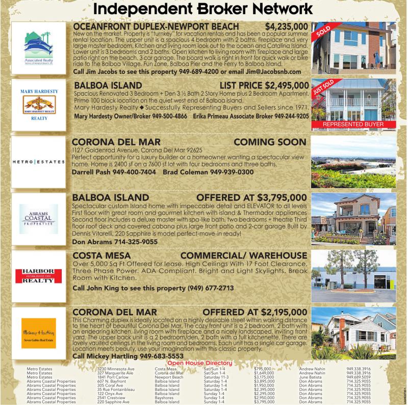Metro Estates 3230 Minnesota Ave Costa Mesa Sat/Sun 1-4 $795,000 Andrew Nahin 949.338.3916 Metro Estates 327 Marguerite Ave Corona del Mar Sat/Sun 1-4 $1,649,000 Andrew Nahin 949.338.3916 Metro Estates 1841 Port Carlow Newport Beach Saturday 11-3 $3,175,000 June Batista 949.689.5059 Abrams Coastal Properties 607 N. Bayfront Balboa Island Saturday 1-4 $3,895,000 Don Abrams 714.325.9055 Abrams Coastal Properties 305 Coral Ave Balboa Island Saturday 1-4 $1,950,000 Don Abrams 714.325.9055 Abrams Coastal Properties 35Rue Fontainbleau Balboa Island Saturday 1-4 $2,395,000 Don Abrams 714.325.9055 Abrams Coastal Properties 122 Onyx Ave Balboa Island Sunday 1-4 $2,295,000 Don Abrams 714.325.9055 Abrams Coastal Properties 2541 Crestview Bayshores Sunday 1-4 $2,950,000 Don Abrams 714.325.9055 Abrams Coastal Properties 220 Sapphire Ave Balboa Island Sunday 1-4 $3,795,000 Don Abrams 714.325.9055
