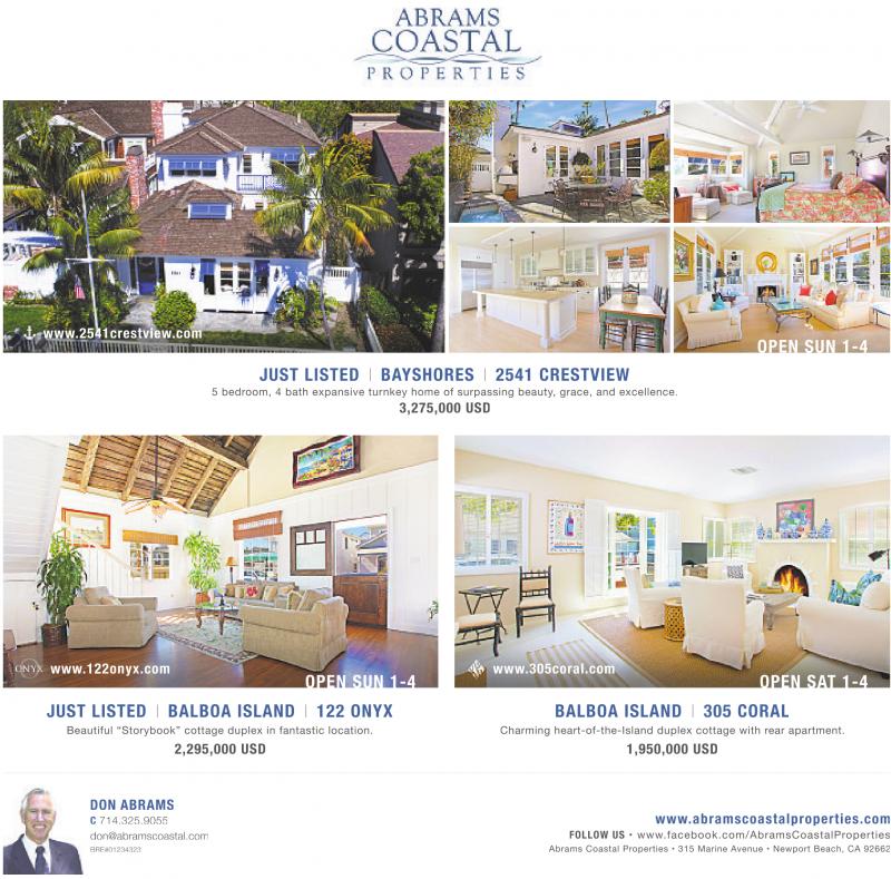 www.2541crestview.com www.122onyx.com 2,295,000 USD DON ABRAMS C 714.325.9055 don@abramscoastal.com BRE#01234323 OPEN SUN 1-4 JUST LISTED | BAYSHORES | 2541 CRESTVIEW 5 bedroom, 4 bath expansive turnkey home of surpassing beauty, grace, and excellence. OPEN SUN 1-4 3,275,000 USD www.305coral.com JUST LISTED | BALBOA ISLAND | 122 ONYX BALBOA ISLAND | 305 CORAL OPEN SAT 1-4 Beautiful “Storybook” cottage duplex in fantastic location. Charming heart-of-the-Island duplex cottage with rear apartment. 1,950,000 USD www.abramscoastalproperties.com FOLLOW US • www.facebook.com/AbramsCoastalProperties Abrams Coastal Properties • 315 Marine Avenue • Newport Beach, CA 92662