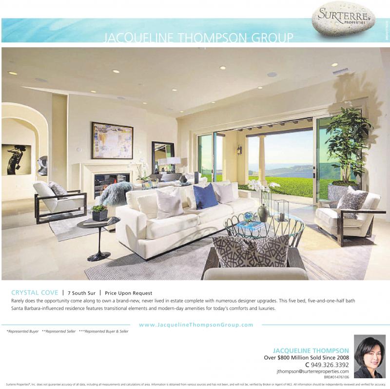 JACQUELINE THOMPSON GROUP CRYSTAL COVE | 7 South Sur | Price Upon Request Rarely does the opportunity come along to own a brand-new, never lived in estate complete with numerous designer upgrades. This five bed, five-and-one-half bath Santa Barbara-influenced residence features transitional elements and modern-day amenities for today’s comforts and luxuries. *Represented Buyer **Represented Seller ***Represented Buyer &Seller www.JacquelineThompsonGroup.com JACQUELINE THOMPSON Over $800 Million Sold Since 2008 C 949.326.3392 jthompson@surterreproperties.com BRE#01476106 Surterre Properties ® ,Inc. does not guarantee accuracy of all data, including all measurements and calculations ofarea. Information is obtained from various sources and has not been, and will not be, verified by Broker or Agent ofMLS. All information should be independently reviewed and verified for accuracy. See also