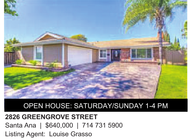 OPEN HOUSE: SATURDAY/SUNDAY 1-4 PM 2826 GREENGROVE STREET Santa Ana | $640,000 | 714 731 5900 Listing Agent: Louise Grasso