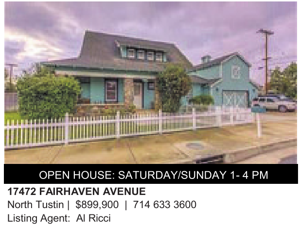 OPEN HOUSE: SATURDAY/SUNDAY 1- 4 PM 17472 FAIRHAVEN AVENUE North Tustin | $899,900 | 714 633 3600 Listing Agent: Al Ricci