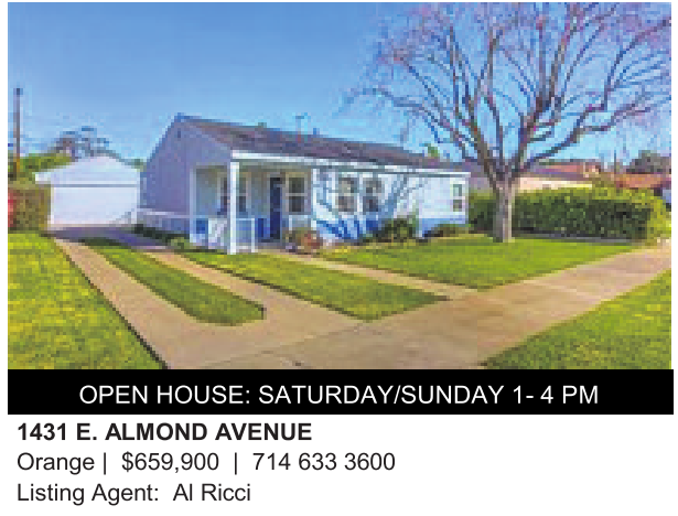 OPEN HOUSE: SATURDAY/SUNDAY 1- 4 PM 1431 E. ALMOND AVENUE Orange | $659,900 | 714 633 3600 Listing Agent: Al Ricci