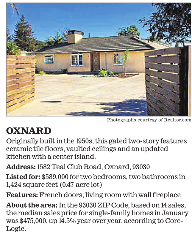 Photographs courtesy of Realtor.com OXNARD Originally built in the 1950s, this gated two-story features ceramic tile floors, vaulted ceilings and an updated kitchen with a center island. Address:1582 Teal Club Road, Oxnard, 93030 Listed for: $589,000 for two bedrooms, two bathrooms in 1,424 square feet (0.47-acre lot) Features: French doors; living room with wall fireplace About the area: In the 93030 ZIP Code, based on 14 sales, the median sales price for single-family homes in January was $475,000, up 14.5% year over year, according to Core- Logic.