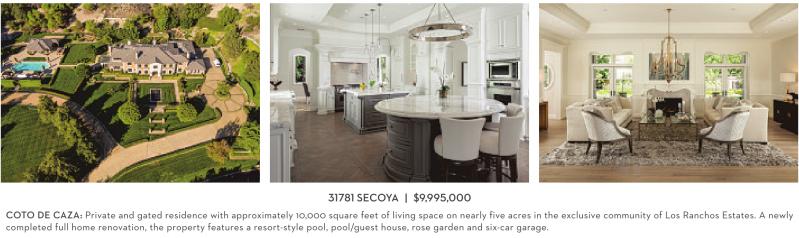 COTO DE CAZA: Private and gated residence with approximately 10,000 square feet of living space on nearly five acres in the exclusive community of Los Ranchos Estates. A newly completed full home renovation, the property features a resort-style pool, pool/guest house, rose garden and six-car garage.