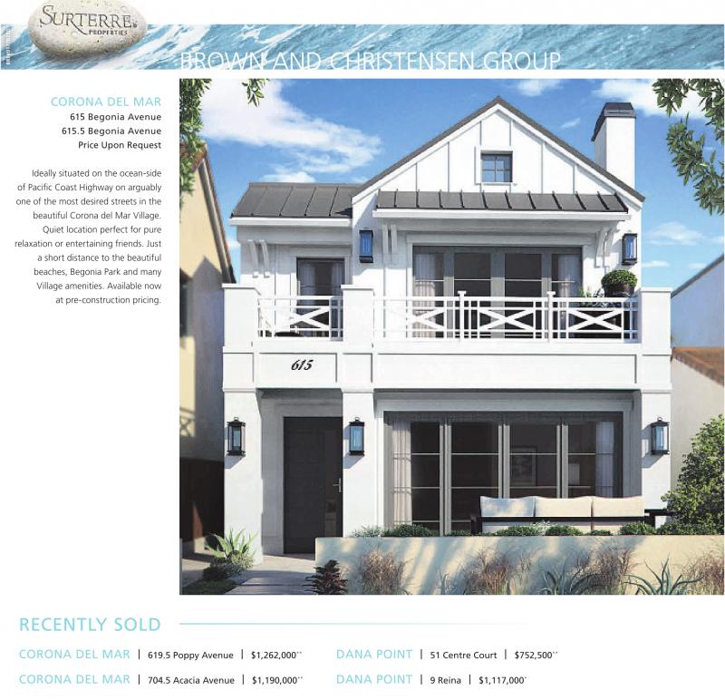 BROWN AND CHRISTENSEN GROUP CORONA DEL MAR 615 Begonia Avenue 615.5 Begonia Avenue Price Upon Request Ideally situated on the ocean-side of Pacific Coast Highway on arguably one of the most desired streets in the beautiful Corona del Mar Village. Quiet location perfect for pure relaxation or entertaining friends. Just a short distance to the beautiful beaches, Begonia Park and many Village amenities. Available now at pre-construction pricing. RECENTLY SOLD CORONA DEL MAR | 619.5 Poppy Avenue | $1,262,000 ** CORONA DEL MAR | 704.5 Acacia Avenue | $1,190,000 ** DANA POINT | 9 Reina | $1,117,000 * DANA POINT | 51 Centre Court | $752,500 ** See also