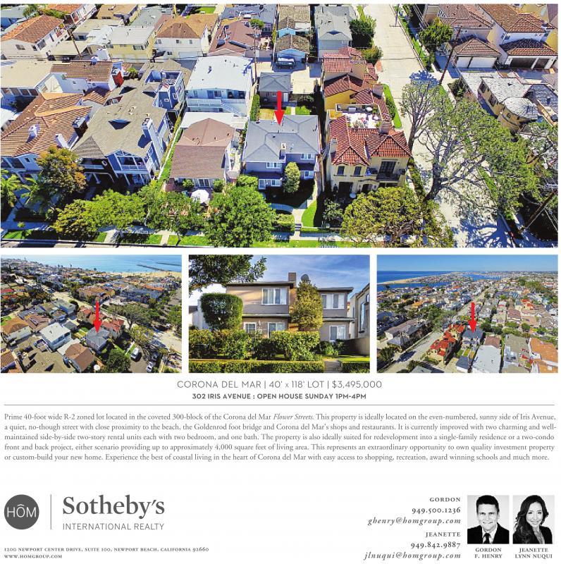 CORONA DEL MAR | 40' X 118' LOT | $3,495,000 302 iris avenue : open house sunday 1pm-4pm Prime 40-foot wide R-2 zoned lot located in the coveted 300-block of the Corona del Mar Flower Streets. This property is ideally located on the even-numbered, sunny side of Iris Avenue, a quiet, no-though street with close proximity to the beach, the Goldenrod foot bridge and Corona del Mar's shops and restaurants. It is currently improved with two charming and wellmaintained side-by-side two-story rental units each with two bedroom, and one bath. The property is also ideally suited for redevelopment into a single-family residence or a two-condo front and back project, either scenario providing up to approximately 4,000 square feet of living area. This represents an extraordinary opportunity to own quality investment property or custom-build your new home. Experience the best of coastal living in the heart of Corona del Mar with easy access to shopping, recreation, award winning schools and much more. 1200 newport center drive, suite 100, newport beach, california 92660 www.homgroup.com gordon 949.500.1236 ghenry@homgroup.com jeanette 949.842.9887 jlnuqui@homgroup.com gordon f. henry jeanette lynn nuqui