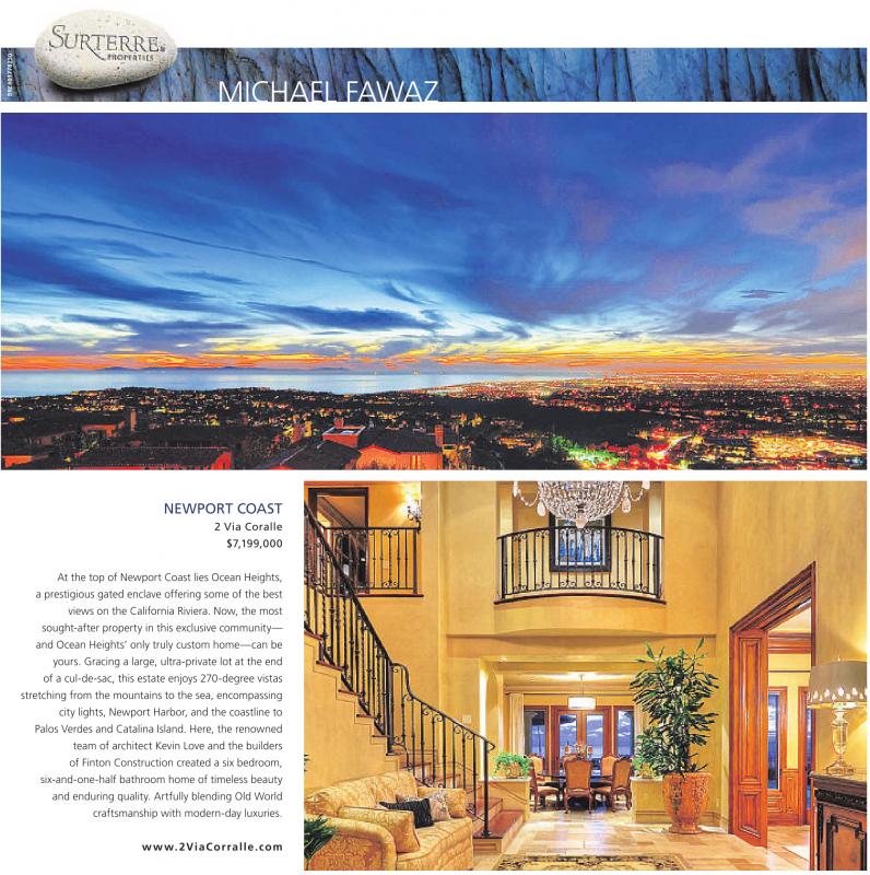 MICHAEL FAWAZ NEWPORT COAST 2 Via Coralle $7,199,000 At the top of Newport Coast lies Ocean Heights, a prestigious gated enclave offering some of the best views on the California Riviera. Now, the most sought-after property in this exclusive community— and Ocean Heights’ only truly custom home—can be yours. Gracing a large, ultra-private lot at the end of a cul-de-sac, this estate enjoys 270-degree vistas stretching from the mountains to the sea, encompassing city lights, Newport Harbor, and the coastline to Palos Verdes and Catalina Island. Here, the renowned team of architect Kevin Love and the builders of Finton Construction created a six bedroom, six-and-one-half bathroom home of timeless beauty and enduring quality. Artfully blending Old World craftsmanship with modern-day luxuries. www.2ViaCorralle.com