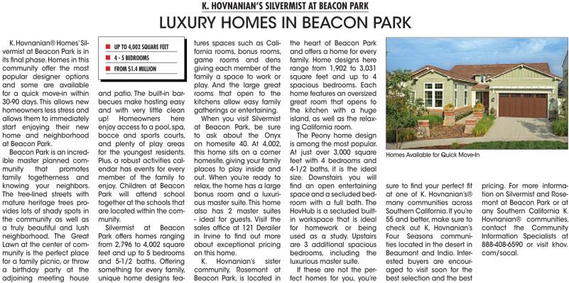 pricing. For more information on Silvermist and Rosemont at Beacon Park or at any Southern California K. Hovnanian® communities, contact the Community Information Specialists at 888-408-6590 or visit khov. com/socal.