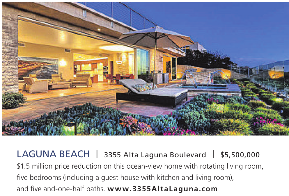 LAGUNA BEACH | 3355 Alta Laguna Boulevard | $5,500,000 $1.5 million price reduction on this ocean-view home with rotating living room, five bedrooms (including a guest house with kitchen and living room), and five and-one-half baths. www.3355AltaLaguna.com