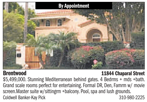 Brentwood 11844Chaparal Street $5,499,000.Stunning Mediterranean behind gates. 4Bedrms +mds +bath. Grandscale rooms perfect for entertaining.Formal DR, Den, Famrm w/ movie screen.Master suite w/sittingrm +balcony.Pool, spaand lush grounds. Coldwell Banker-Kay Pick 310-980-2225