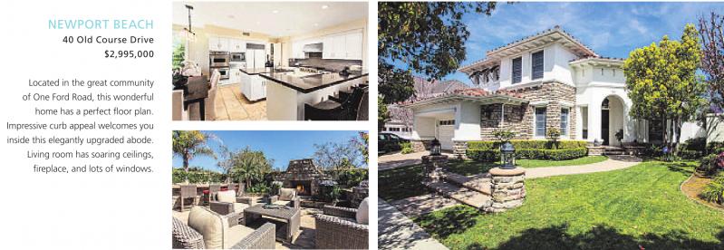NEWPORT BEACH 40 Old Course Drive $2,995,000 Located in the great community of One Ford Road, this wonderful home has a perfect floor plan. Impressive curb appeal welcomes you inside this elegantly upgraded abode. Living room has soaring ceilings, fireplace, and lots of windows. See also