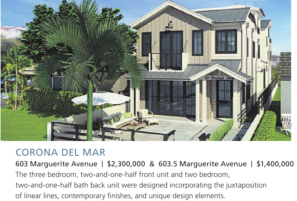603 Marguerite Avenue | $2,300,000 & 603.5 Marguerite Avenue | $1,400,000 The three bedroom, two-and-one-half front unit and two bedroom, two-and-one-half bath back unit were designed incorporating the juxtaposition of linear lines, contemporary finishes, and unique design elements.