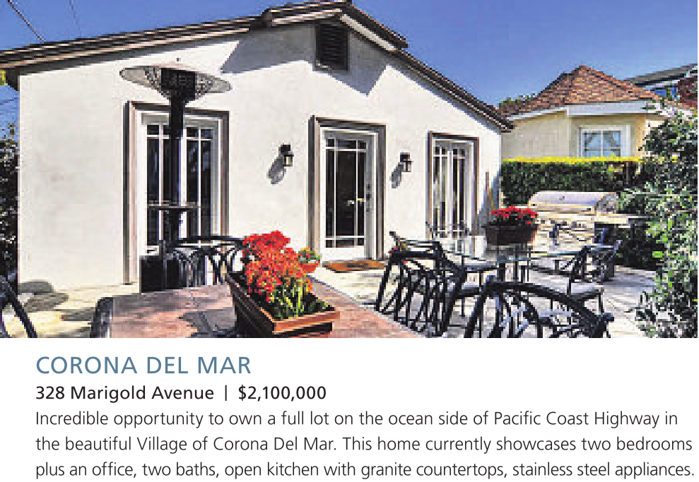 328 Marigold Avenue | $2,100,000 Incredible opportunity to own a full lot on the ocean side of Pacific Coast Highway in the beautiful Village of Corona Del Mar. This home currently showcases two bedrooms plus an office, two baths, open kitchen with granite countertops, stainless steel appliances.