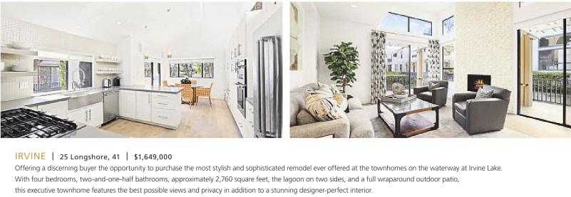 IRVINE | 25 Longshore, 41 | $1,649,000 Offering a discerning buyer the opportunity to purchase the most stylish and sophisticated remodel ever offered at the townhomes on the waterway at Irvine Lake. With four bedrooms, two-and-one-half bathrooms, approximately 2,760 square feet, the lagoon on two sides, and a full wraparound outdoor patio, this executive townhome features the best possible views and privacy in addition to a stunning designer-perfect interior.