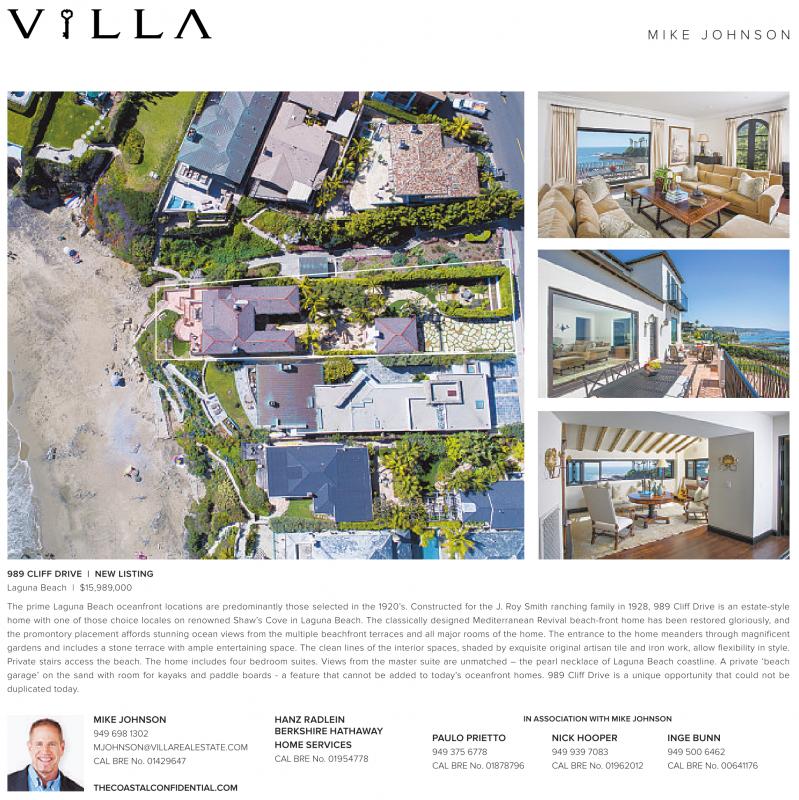 M I K E J O H N S O N 989 CLIFF DRIVE | NEW LISTING Laguna Beach | $15,989,000 The prime Laguna Beach oceanfront locations are predominantly those selected in the 1920’s. Constructed for the J. Roy Smith ranching family in 1928, 989 Cliff Drive is an estate-style home with one of those choice locales on renowned Shaw’s Cove in Laguna Beach. The classically designed Mediterranean Revival beach-front home has been restored gloriously, and the promontory placement affords stunning ocean views from the multiple beachfront terraces and all major rooms of the home. The entrance to the home meanders through magnificent gardens and includes a stone terrace with ample entertaining space. The clean lines of the interior spaces, shaded by exquisite original artisan tile and iron work, allow flexibility in style. Private stairs access the beach. The home includes four bedroom suites. Views from the master suite are unmatched – the pearl necklace of Laguna Beach coastline. A private ‘beach garage’ on the sand with room for kayaks and paddle boards - a feature that cannot be added to today’s oceanfront homes. 989 Cliff Drive is a unique opportunity that could not be duplicated today. MIKE JOHNSON 949 698 1302 MJOHNSON@VILLAREALESTATE.COM CAL BRE No. 01429647 HANZ RADLEIN BERKSHIRE HATHAWAY HOME SERVICES CAL BRE No. 01954778 PAULO PRIETTO 949 375 6778 CAL BRE No. 01878796 IN ASSOCIATION WITH MIKE JOHNSON NICK HOOPER 949 939 7083 CAL BRE No. 01962012 INGE BUNN 949 500 6462 CAL BRE No. 00641176 THECOASTALCONFIDENTIAL.COM