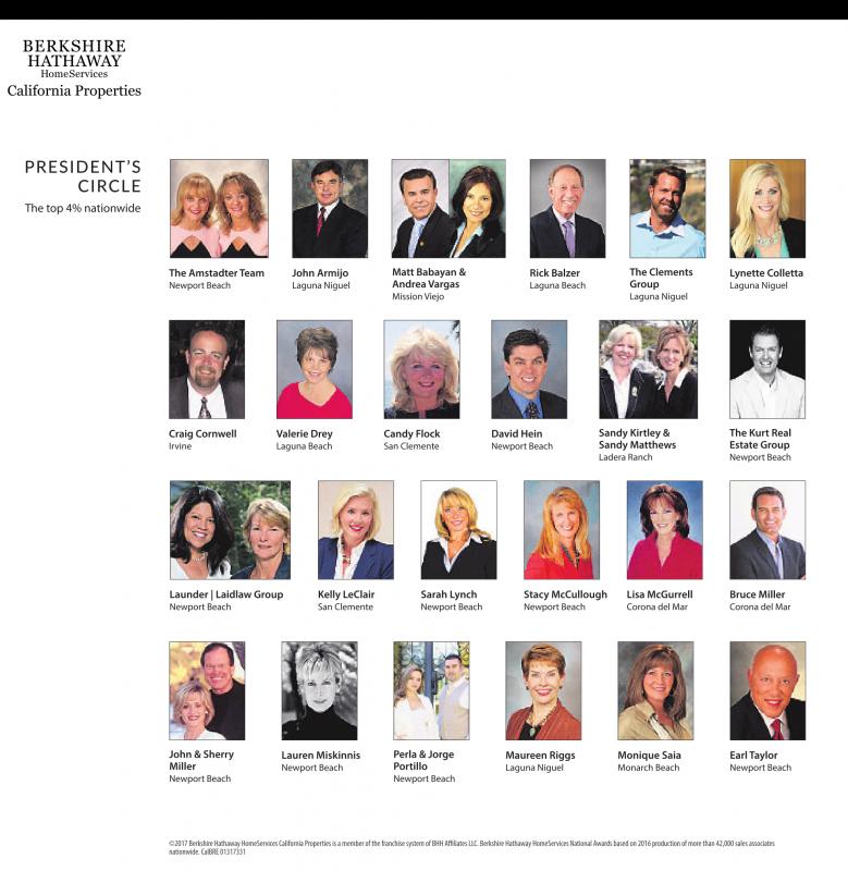 PRESIDENT’S CIRCLE The top 4% nationwide TheAmstadterTeam NewportBeach John Armijo Laguna Niguel Matt Babayan& Andrea Vargas Mission Viejo Rick Balzer Laguna Beach TheClements Group Laguna Niguel LynetteColletta Laguna Niguel Craig Cornwell Irvine Valerie Drey Laguna Beach Candy Flock San Clemente David Hein NewportBeach Sandy Kirtley & Sandy Matthews LaderaRanch TheKurtReal Estate Group NewportBeach Launder |LaidlawGroup NewportBeach Kelly LeClair San Clemente SarahLynch NewportBeach StacyMcCullough NewportBeach Lisa McGurrell Corona del Mar BruceMiller Corona delMar John &Sherry Miller NewportBeach Lauren Miskinnis NewportBeach Perla &Jorge Portillo NewportBeach Maureen Riggs Laguna Niguel MoniqueSaia Monarch Beach Earl Taylor NewportBeach ©2017 BerkshireHathaway HomeServices California Properties is amember of thefranchise system of BHH Affiliates LLC. BerkshireHathawayHomeServices National Awards basedon2016 production of morethan42,000 sales associates nationwide.CalBRE 01317331 See also